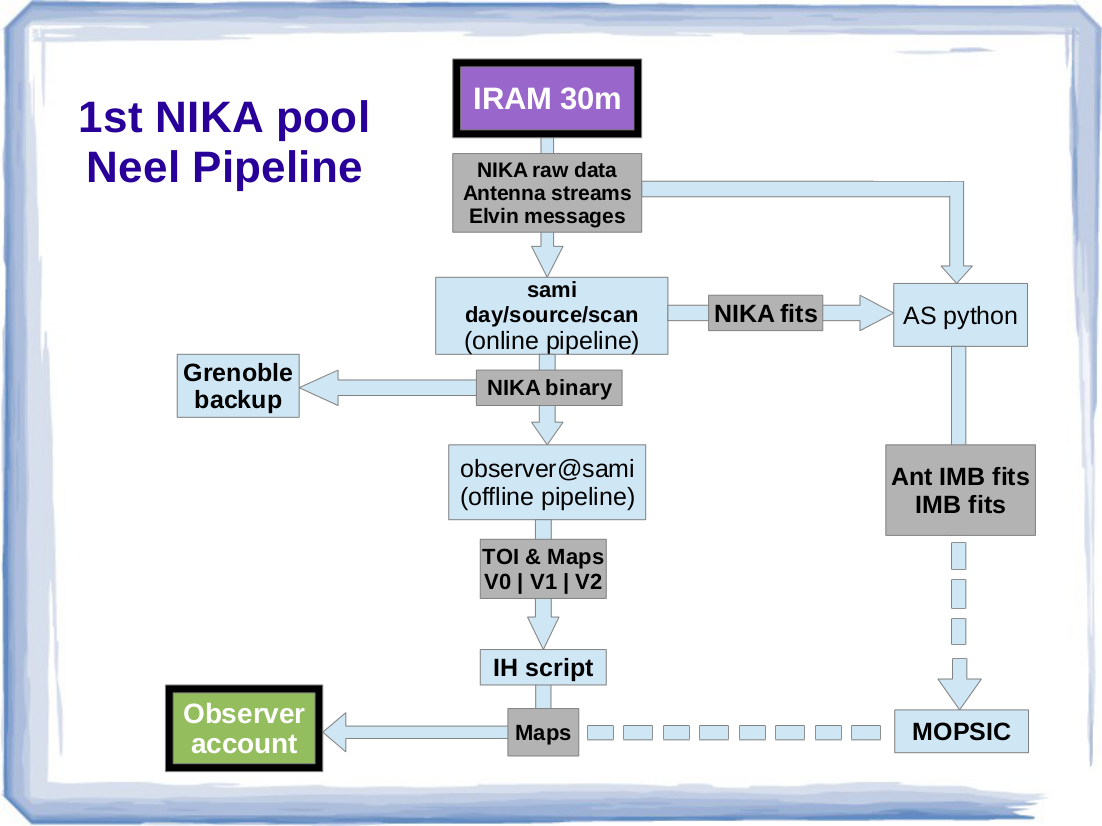 The following diagram shows the NIKA data flow from the IRAM 30m telescope to the observers' accounts.